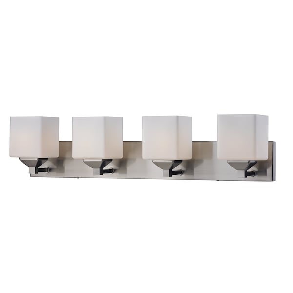 Rectangular shaped hardware and complimenting cube shades create a straight contemporary look. This four light vanity is finished in brushed nickel, and includes matte opal shades. This fixture will add a touch of contemporary to any decor.