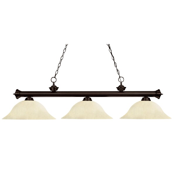 Elegant and traditional best describes this beautiful three light fixture. Finished in oil rubbed bronze and paired with golden mottle shades, this three light fixture would be equally at home in the game room, or anywhere else in the house needing a touch of timeless charm. 72 inches of chain per side is included to ensure a perfect hanging height.