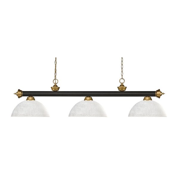 Elegant and traditional best describes this beautiful three light fixture. Finished in oil rubbed Bronze & Satin Gold and paired with dome white linen shades, this three light fixture would be equally at home in the game room, or anywhere else in the house needing a touch of timeless charm. 72 inches of chain per side is included to ensure a perfect hanging height.