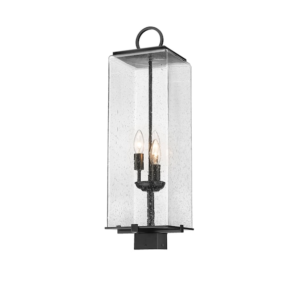 This three-light outdoor post mount fixture provides a warm glow for your porch or patio. It features a seedy glass shade in a black finish with steel construction and a rectangular base, bringing coastal vibes that make the neighbors look twice.