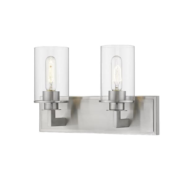 This mid-century modern two-light vanity exudes an elegant sophistication. A lux brushed nickel finish gleams against the brilliance of the clear glass cylinder shades.
