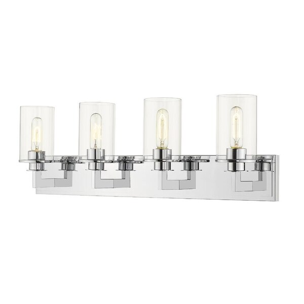 Bring a bold contemporary style to a modern bathroom with this mid-century modern four-light vanity. A stunning chrome finish underscores the luminous clear glass shades.