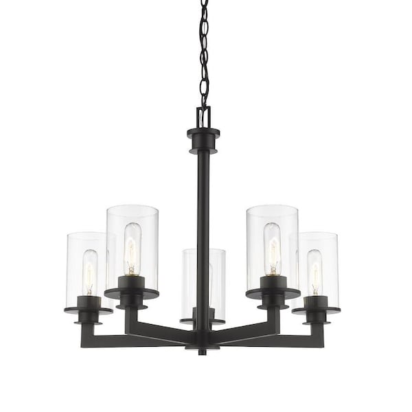 A touch of old world style gives this mid-century modern five-light chandelier elegant charm. A bronze finish emphasizes the glowing brilliance of the clear glass cylinder-shaped shades.