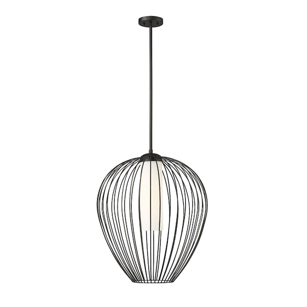 An inner shade of white opal glass create inviting illumination for a modern one-light pendant with big personality. Its outer cage frame features slender spokes that curve and taper to create a rounded silhouette, adding bold style over an island, or living room. The fixture features a rich matte black finish to set a refined but casual ambiance.