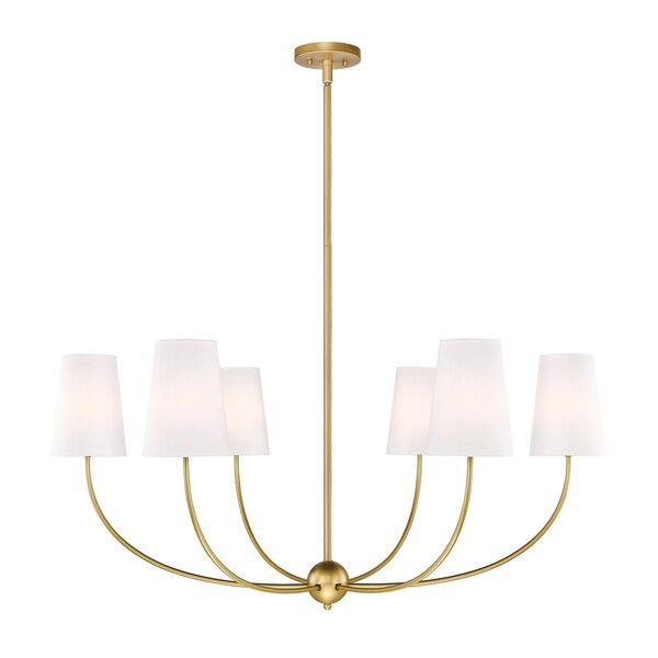 The Shannon six-light chandelier becomes a focal point in any modern space with its easy yet sophisticated aesthetic. Embrace the beauty of a rubbed brass finish steel frame with subtly curved arms and lights capped with classic white fabric shades reflecting traditional style. Infuse ambient lighting over a dining ensemble, in an entryway, or in a main living area with this tasteful chandelier.