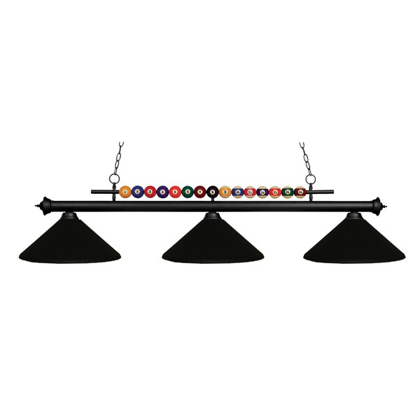Created with the game room in mind, this three light fixture would be a perfect addition above pool table due to its billiard ball detailing. Finished in matte black, this fixture is paired with matching matte black shades, and comes with 72’’ chains on both sides of the fixture, in order to ensure the perfect hanging height.