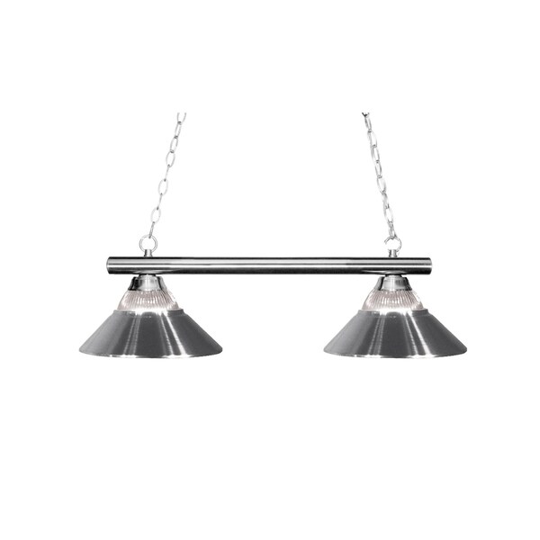 The simple styling of this two light fixture creates a classic statement. Finished in chrome, this two light fixture uses clear ribbed glass and chrome metal shades to compliment its classic look, and 36’’ of chain per side is included to ensure the perfect hanging height.
