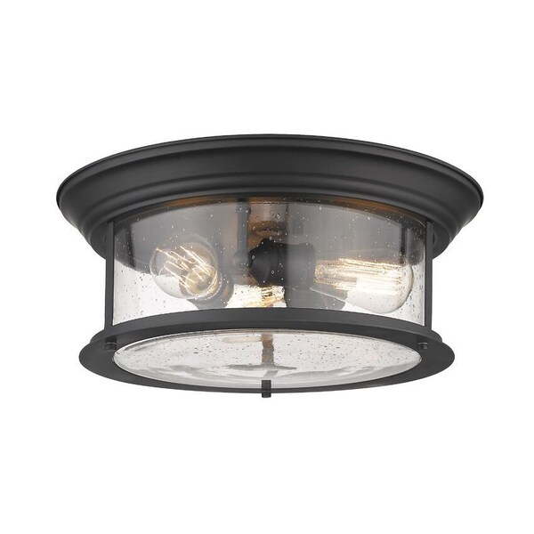 Cool industrial ambiance offers a stylish look to transitional spaces in need of functional, fashionable fixtures. With bold Matte Black finish metal providing a circular cage-like frame and a wide cylindrical clear seedy glass shade completing its visual package, this three-light flush mount ceiling light becomes an integral part of an overall design scheme as it delivers ambient lighting.