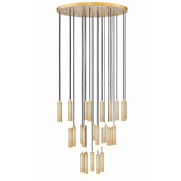 Dive into sophisticated minimalism with the rich and refined modern gold finish and streamlined silhouette of this grand 27-light chandelier. It's a round canopy that hosts braided cords and elongated tubes, creating bold, tiered lighting for your foyer, living or dining room. The warmth of its gold finish sets the tone for surrounding decor, delivering on an elegant presentation that's sure to enchant.
