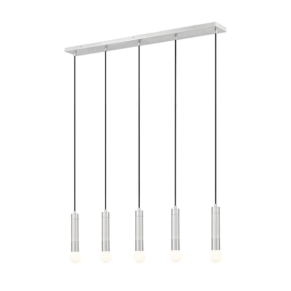 Brighten a kitchen island or family dining table with the easy minimalism of this modern five-light linear chandelier. Each light features a braided cord and an elongated tube, casting bright, inviting ambiance perfect for daily living or entertaining. A brushed nickel finish graces the steel frame, offering versatile style and sophistication.