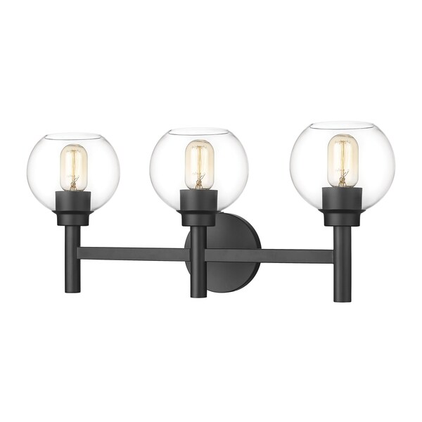 The precision of a perfect circle defines the modern ambiance of a contemporary three-light vanity wall light. From the Sutton collection, the sconce boasts a trio of torch-style lights, complete with chic matte black finish framing and a round wall plate. Three open-edged globe shades are precisely crafted in clear glass, delivering maximum illumination to your vanity and bathroom space.