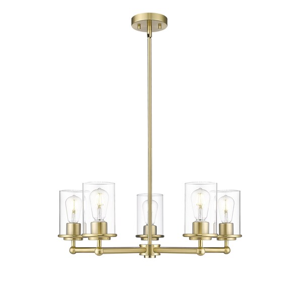 Complete a timeless kitchen or living area with the understated flair of a modern five-light chandelier from the impeccable Thayer collection. Clean lines and gentle curves highlight its silhouette, with cylinders of smooth, clear glass surrounding each light and offering a light, airy ambiance over a breakfast nook or entryway. A refined luxe gold finish adds the perfect touch of sleek sophistication.