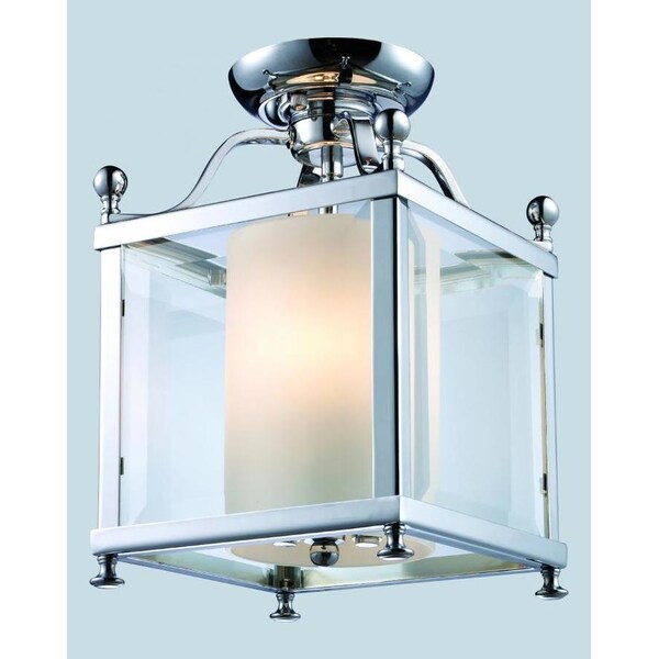Worlds collide when modern styling fuses with traditional warmth to create an efficiently constructed ceiling fixture. Chrome geometric shapes and clear beveled glass create clean look, while the matte opal glass inside the fixture will be sure to give any room a warm, inviting light.