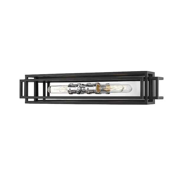 Exquisitely crafted with bold, black lines surrounding a gleaming, chrome frame, this two-light vanity will illuminate your home in style. This handsome fixture looks especially elegant when placed over a bathroom mirror.