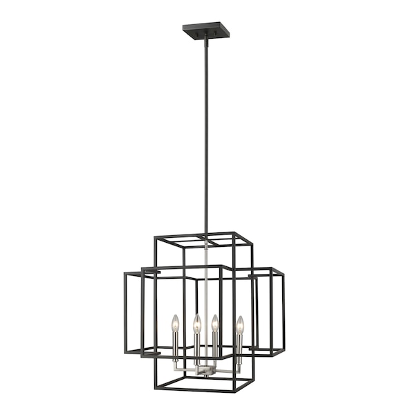 A modern space takes on new dimension with the addition of this dynamic four-light pendant. Sleek brushed nickel finish steel candelabra-style bulb bases pose a charming contrast to a boxy geometric black steel frame, delivering palette versatility and fresh style.