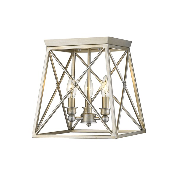 Indulge in an exercise of geometrics and stunning interior decor, adding this three-light flush mount ceiling light to a main living space. An open frame made from Antique Silver finish metal shelters a candelabra mount that softens its angular silhouette, mixing motifs and creating a compelling look.