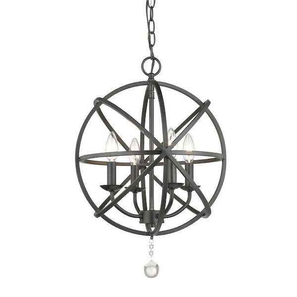 Blend a modern dose of space-inspired design with a softened traditional touch, and add this orb-shaped matte black finish steel four-light chandelier to a dining ensemble or entryway. Customizable options allow a personalized choice that makes its frame interior, candelabra bulb bases, and finials offer a perfect blend to suit your style and tastes.