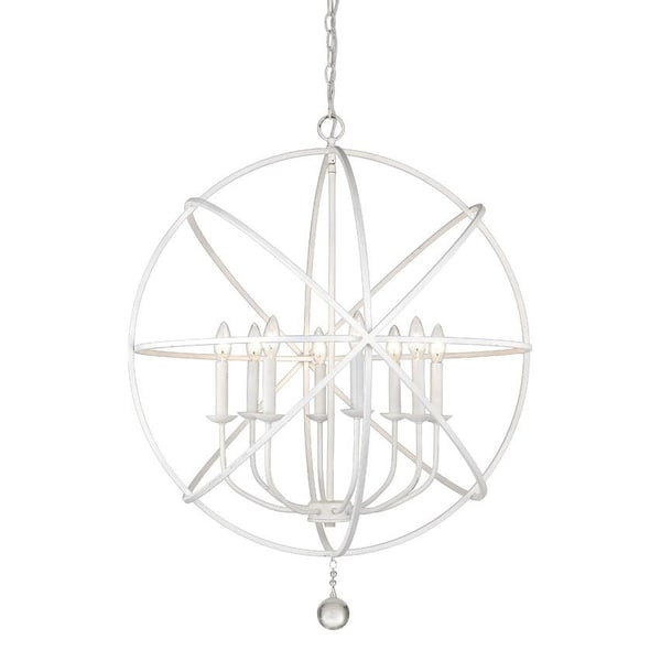 Bring stunning design and fresh personality to a dining or living space with this matte white open-orb eight-light chandelier. Blending style motifs, its space-inspired steel frame delivers an artful ambiance, and customizable finishes over its frame interior, finials, and candelabra-style bulb bases offer coveted flexibility for a tailored room decor.