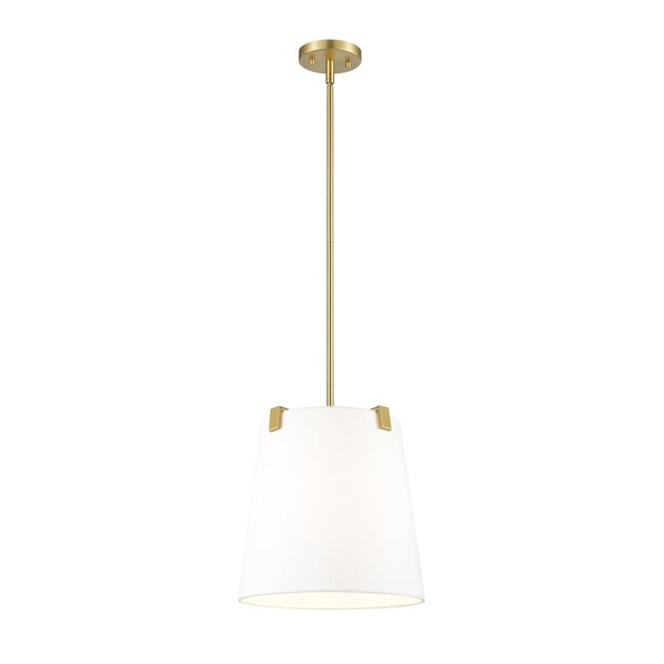 Indulge in a modernized version of traditional lighting with a three-light pendant delivering graceful and fluid design elements. Glam-inspired modern gold finish steel framing with clips attaches to a white linen fabric shade offers low-profile elegance, as candelabra lights diffuse illumination beautifully. This fixture is dimmable, creating mood lighting and efficient functionality.