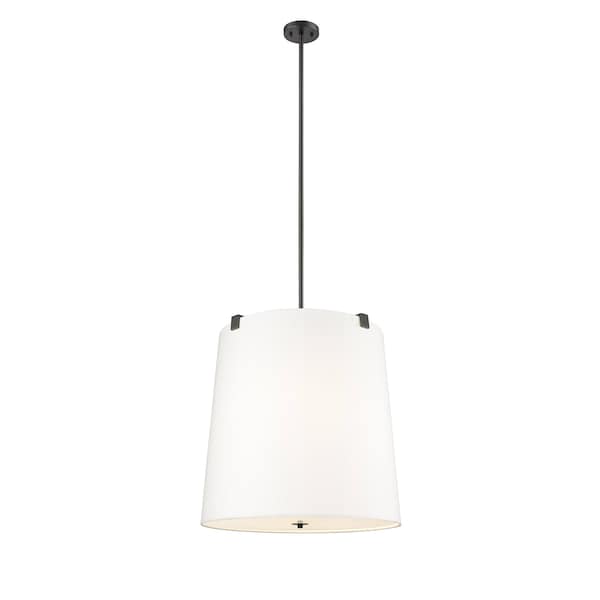 This tastefully styled six-light pendant reflects a tribute to conventional yet chic traditional aesthetic. Bold matte black finish steel framing with clips attaches to a white linen fabric shade, offering a low-profile vibe, as candelabra lights diffuse illumination beautifully. This fixture is dimmable, creating mood lighting and efficient functionality.