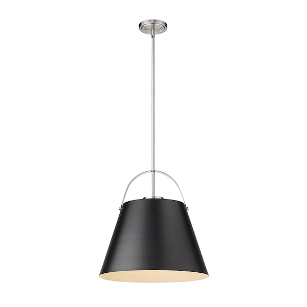 Classic industrial style adds a casual influence to this transitional single-light pendant, a superb choice for a kitchen or entertaining space. With a tapered matte black finish metal shade and brushed nickel finish steel frame, it offers up a relaxing aesthetic with plenty of personality.
