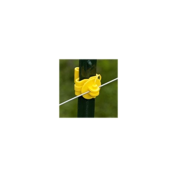 Use for fastening or releasing an electrified wire to or from an electric fence T-post. Holds wire tightly. Release by pulling the pin. For 1.25 and 1.33 T-posts. Yellow color. 25/Bag.
