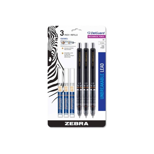 Zebra Delguard Mechanical Pencil, 0.5 mm, HB #2.5, Black Lead, Black Barrel, 3/Pack