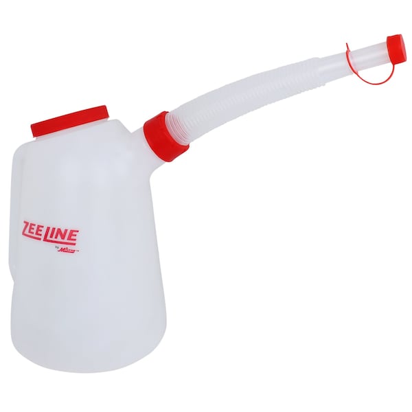 This is a 5quart HDPE measurer with a flexible spout It includes a threaded lid and cap for the spout Replacement lids ZE758G and spouts ZESPOUT757 are available This product comes in a translucent white color to easily see the amount of fluid inside
