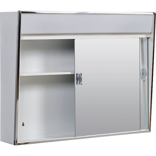 Surface mounted white powder-coated steel medicine cabinet with built-in top lighting. Cabinet lighting is equipped with switch and spare outlet. Two sliding mirror doors provide accessibility to 2 fixed shelf storage inside the cabinet.