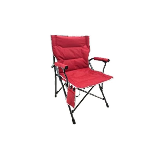 Heated hard arm quad chair with 5W heated lumbar and seat. Dark red 600D polyester fabric. Gun metal grey steel frame. Open 24.4 x 23.22 x 36.22. Folded 9.06 x 5.51 x 37.01. Three different heating options low medium & high. Powers off. Portable rechargeable battery pack TV#122273 not included.