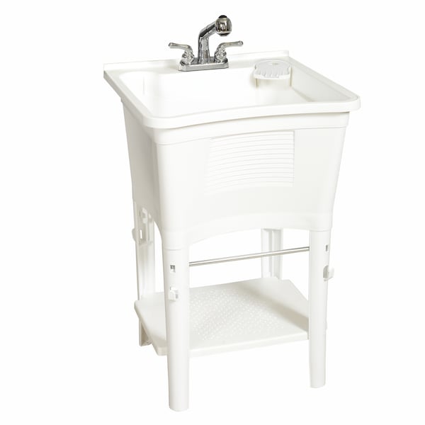 The Zenna Home Freestanding Utility Laundry Tub with Pull-out Faucet is an all-in-one sink solution with a unique contoured front profile and taller height than typical tubs, so there's less bending and stress on your back while working. The tub has a large 20-gallon capacity and it features a molded washboard cleaning surface on the inner front side, plus a chrome towel bar and handy utility hooks built into the legs. For additional efficiency, the multi-functional shelf located between the legs can be easily removed and placed inside the tub for use as a drying rack or work surface. The tub's faucet deck comes predrilled, allowing easy installation of the included 4 in. pull-out chrome faucet. There are pilot holes and guides molded into the underside for easy installation of other soap pump or sprayer configurations. All of the necessary plumbing lines required for installation are included with the tub.