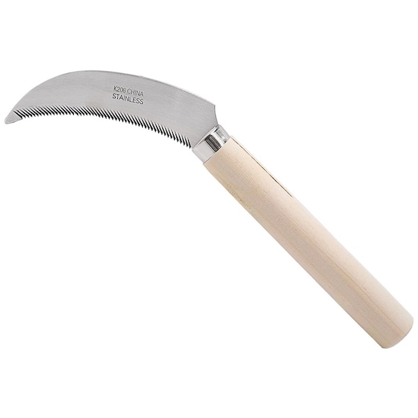 The Zenport K206 Harvest Sickle is the perfect tool for effortless harvesting and pruning tasks in your garden or farm. Featuring a 4.3-inch curved stainless steel blade with light serration, this versatile tool delivers precision and durability for cutting stems, vines, and small branches. Known as a ''berry knife,'' it is especially ideal for delicate harvesting tasks such as gathering berries, herbs, and flowers without causing unnecessary damage to your plants.The ergonomic wooden handle provides a comfortable grip, allowing for extended use without strain. Whether youre trimming ornamental plants, pruning vegetables, or cutting herbs, the Zenport K206 Harvest Sickle is your reliable gardening companion. Its compact size and lightweight design make it easy to maneuver, giving you precise control for a variety of gardening applications.Crafted with durable stainless steel, this sickle resists rust and ensures long-lasting performance even with frequent use in outdoor conditions. Its slightly serrated edge enhances its cutting efficiency, making it a valuable addition to any gardener's toolkit. Whether youre a home gardener, florist, or farmer, this versatile tool simplifies your harvesting tasks.