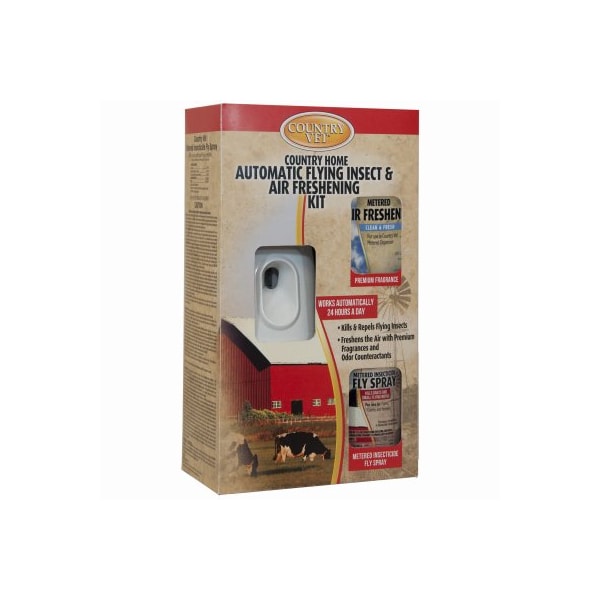Country Vet, flying insect odor kit Includes wall dispenser, 1 metered fly spray 1 metered clean n' fresh refill 30 days control of insectodor Fully automatic control of flies, mosquitoes moths, as well as an air freshener Active ingredient Pyrethrin