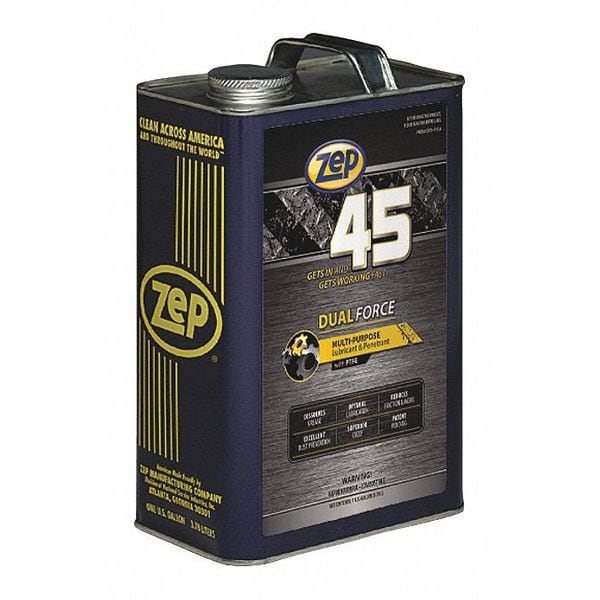 General Purpose Lubricant, Wet, Zep, Zep 45 Dual Force, Net Fill 128 oz, Container Size 1 gal, Lubricant Container Jug, Petroleum Distillates, No Additives Primary Additive, Min. Operating Temp. -55 Degrees F, Max. Operating Temp. 250 Degrees F, NSF Rating Not Rated, 50 State VOC Compliant Yes, VOC Content 2 Percent, Lubricant Color Amber, Odorless No, Non-Flammable Flammability, Non-Flammable, Flash Point Greater Than 200 Degrees F, Standards CARB Compliant