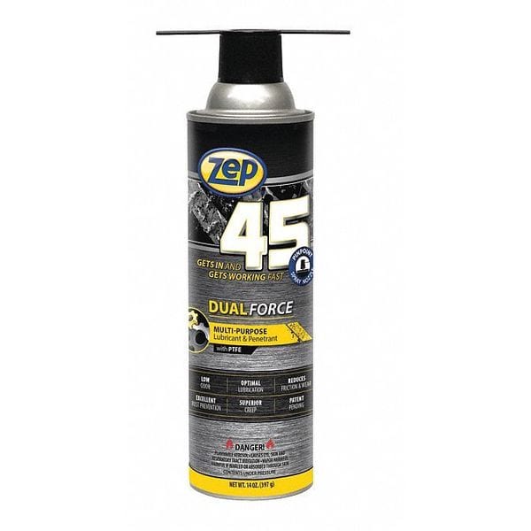 General Purpose Lubricant, Wet, Zep, Zep 45 Dual Force, Net Fill 14 oz, Container Size 14 oz, Lubricant Container Aerosol Can, Petroleum Distillates, PTFE Primary Additive, Min. Operating Temp. -55 Degrees F, Max. Operating Temp. 250 Degrees F, NSF Rating Not Rated, 50 State VOC Compliant Yes, VOC Content 5 Percent, Lubricant Color Amber, Odorless No, Flammable Flammability, Extremely Flammable Aerosol (Category 1), Standards CARB Compliant