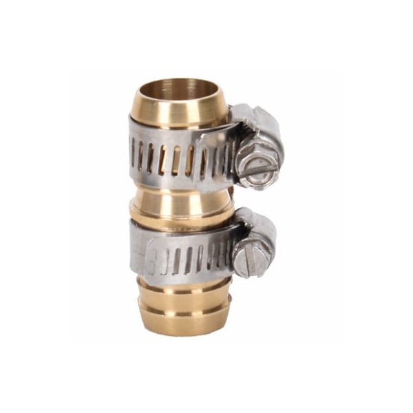 Green Thumb 3/4 barb-style hose mender repairs damaged hose ends. Heavy-duty brass construction. Stainless steel clamp. Easy to hook up.