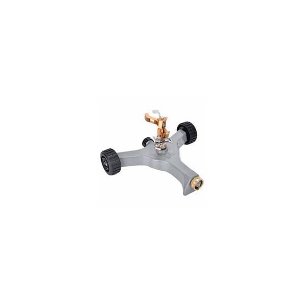 Green Thumb, brass, heavy-duty pulsating sprinkler covers an area of up to 3,379 sq ft. 65ft diameter Features dual spray settings, durable brass head and metallic silver base with a wide frame that resists tipping. Large wheels make movement easy. Quick-connect system.