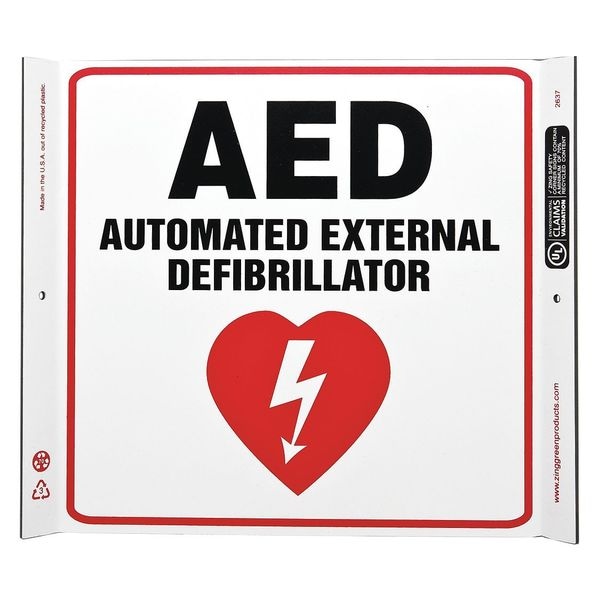 First Aid Sign, Sign Subject Matter Medical and Hospital, Height 10 in, Width 10 in, Sign Material Plastic, Sign Mounting Style With Mounting Holes, Legend AED, Printed Language English