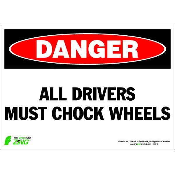 Danger Sign, Sign Subject Matter Chock Wheels, Height 10 In., Width 14 In., Sign Material Polyester, Sign Mounting Style Adhesive Surface, Header Danger, Legend All Drivers Must Chock Wheels, Printed Language English, Sign Shape Rectangle