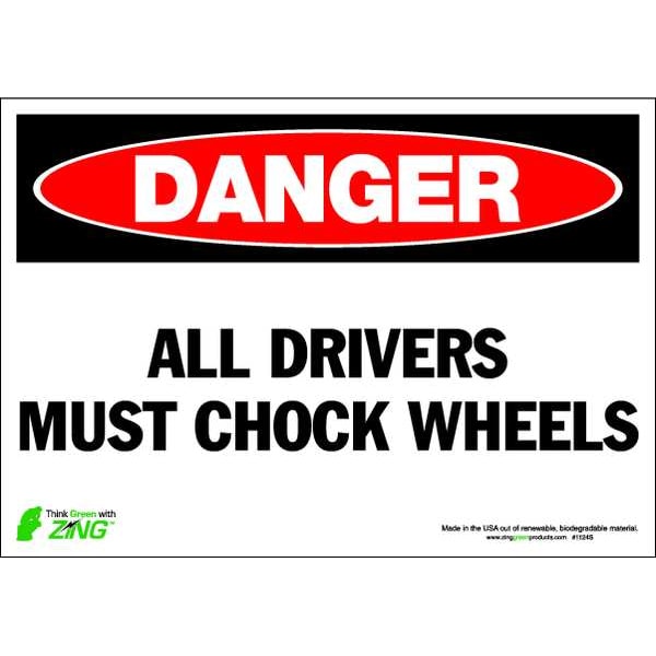 Danger Sign, Sign Subject Matter Chock Wheels, Height 7 In., Width 10 In., Sign Material Polyester, Sign Mounting Style Adhesive Surface, Header Danger, Legend All Drivers Must Chock Wheels, Printed Language English, Sign Shape Rectangle