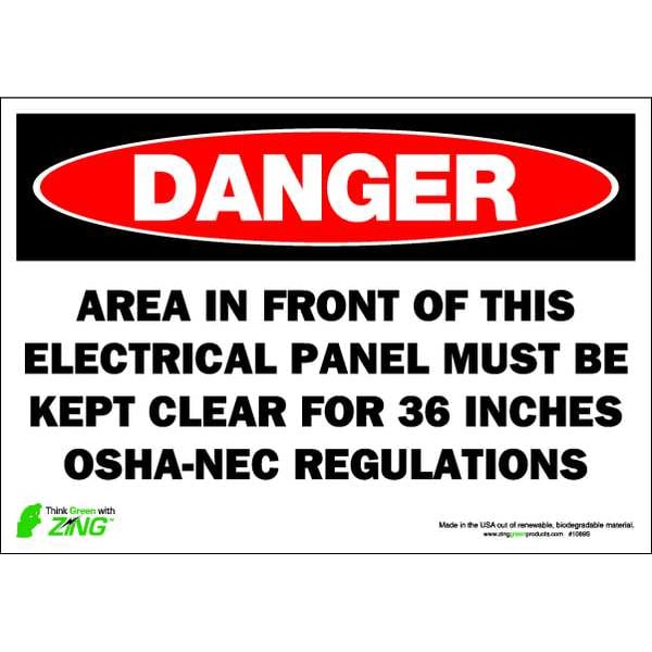 Danger Sign, Sign Subject Matter Electrical Hazard, Height 7 in, Width 10 in, Sign Material Polyester, Sign Mounting Style Adhesive Surface, Header Danger, Legend Area In Front of This Electrical Panel Must Be Kept Clear For 36 Inches. OSHA-NEC Regulations, Printed Language English, Sign Shape Rectangle
