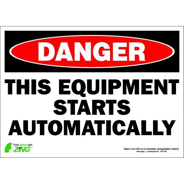 Danger Sign, Sign Subject Matter Machine and Operational, Height 10 In., Width 14 In., Sign Material Polyester, Sign Mounting Style Adhesive Surface, Header Danger, Legend This Equipment Starts Automatically, Printed Language English, Sign Shape Rectangle