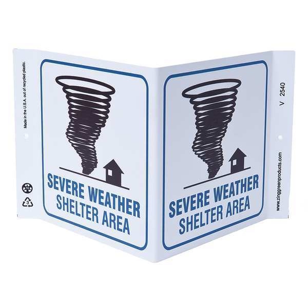 Emergency Sign, Sign Subject Matter Assembly or Shelter, Evacuation, Height 7 in, Width 12 in, Sign Material Plastic, Sign Mounting Style V-Shaped, With Mounting Holes, Legend Severe Weather Shelter, Printed Language English, Sign Shape V-Shaped