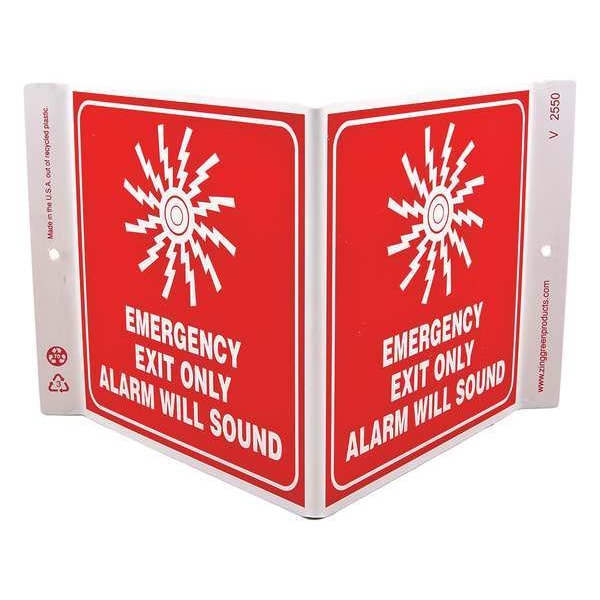 Emergency Exit Sign, Sign Subject Matter Exit and Entrance, Height 7 In., Width 12 In., Sign Material Plastic, Sign Mounting Style With Mounting Holes, V-Shaped, Legend Emergency Exit Only Alarm Will Sound (Picto), Printed Language English, Sign Shape V-Shaped