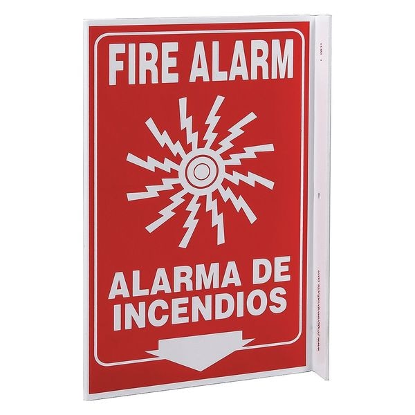 Fire Alarm Sign, Sign Subject Matter Fire Equipment, Height 11 in, Width 8 in, Sign Material Plastic, Sign Mounting Style With Mounting Holes, L-Shaped, Legend Fire Alarm/Alarma De Incendios, Printed Language English, Spanish, Sign Shape L-Shaped