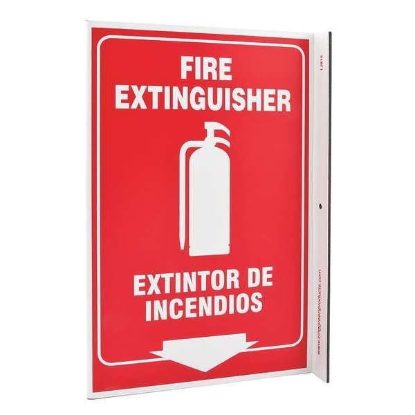 Fire Extinguisher Sign, Sign Subject Matter Fire Equipment, Height 11 in, Width 8 in, Sign Material Plastic, Sign Mounting Style With Mounting Holes, L-Shaped, Legend Fire Extinguisher/Extintor De Incendios, Printed Language English, Spanish, Sign Shape L-Shaped