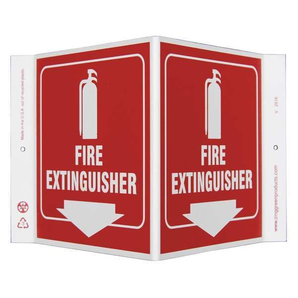 Fire Extinguisher Sign, Sign Subject Matter Fire Equipment, Height 7 in, Width 12 in, Sign Material Plastic, Sign Mounting Style V-Shaped, With Mounting Holes, Legend Fire Extinguisher, Printed Language English, Sign Shape V-Shaped