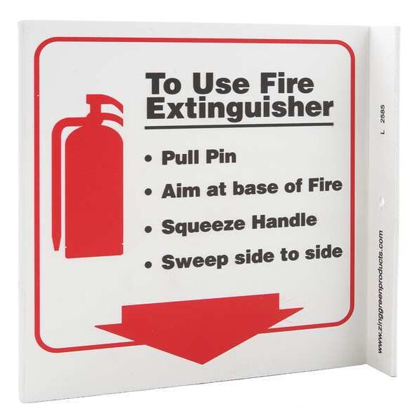 Fire Extinguisher Sign, Sign Subject Matter Fire Equipment, Height 7 in, Width 7 in, Sign Material Plastic, Sign Mounting Style With Mounting Holes, L-Shaped, Legend To use Fire Extinguisher-Pull Pin, Aim at Base of Fire, Squeeze Handle, Sweep Side To Side, Printed Language English, Sign Shape L-Shaped