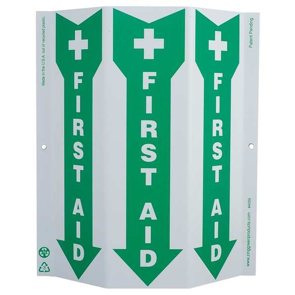 First Aid Sign, Sign Subject Matter First Aid, Height 12 In., Width 9 In., Sign Material Plastic, Sign Mounting Style With Mounting Holes, 3-Sided, Header No Header, Legend First Aid (Arrow Pointing Down Pictogram), Printed Language English