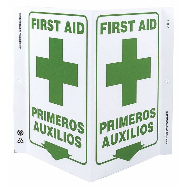 First Aid Sign, Sign Subject Matter First Aid, Height 11 In., Width 7 In., Sign Material Plastic, Sign Mounting Style With Mounting Holes, V-Shaped, Legend First Aid/Primeros Auxilios, Printed Language English, Spanish, Sign Shape V-Shaped